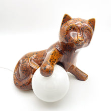 Lampe chat vintage des années 60/70 en céramique émaillée et globe en verre. Bel émaillage brun moucheté. Très belle pièce décorative élégante et originale. Modèle rare. Parfait-état.
