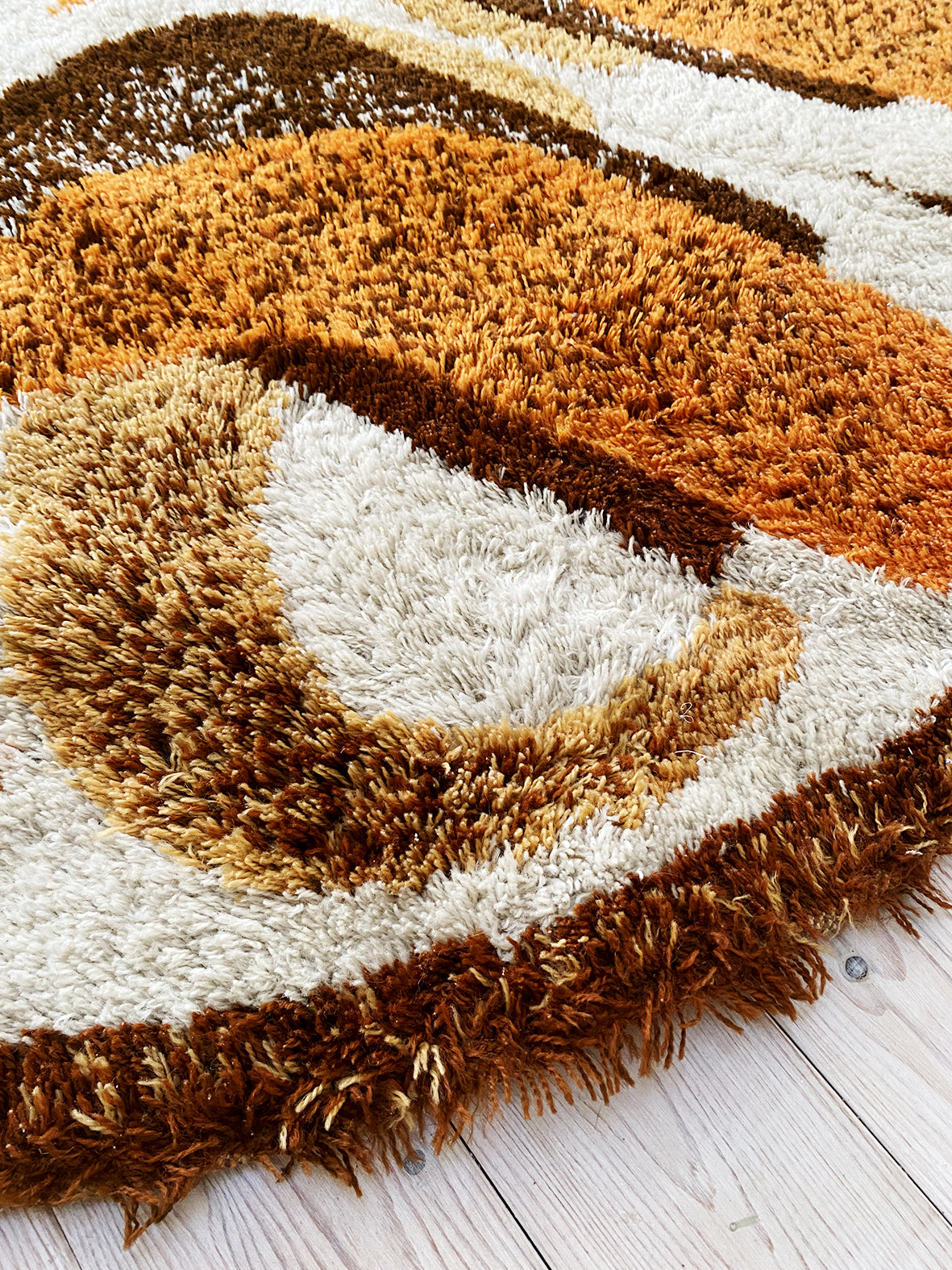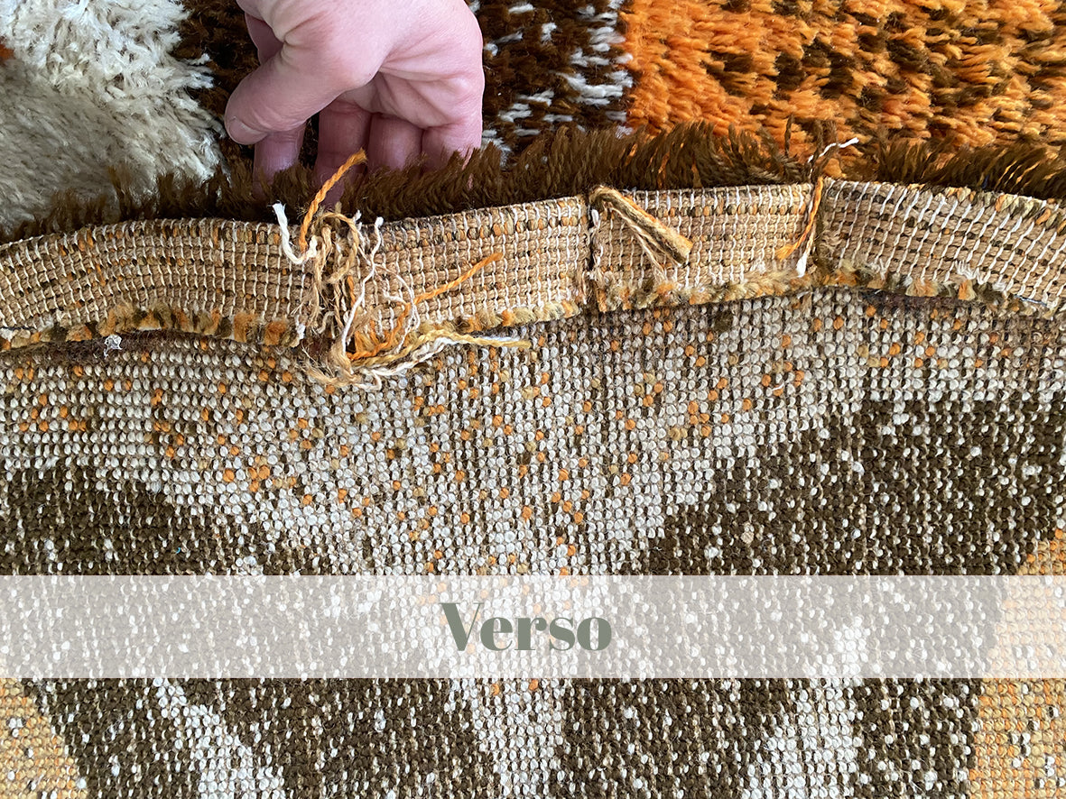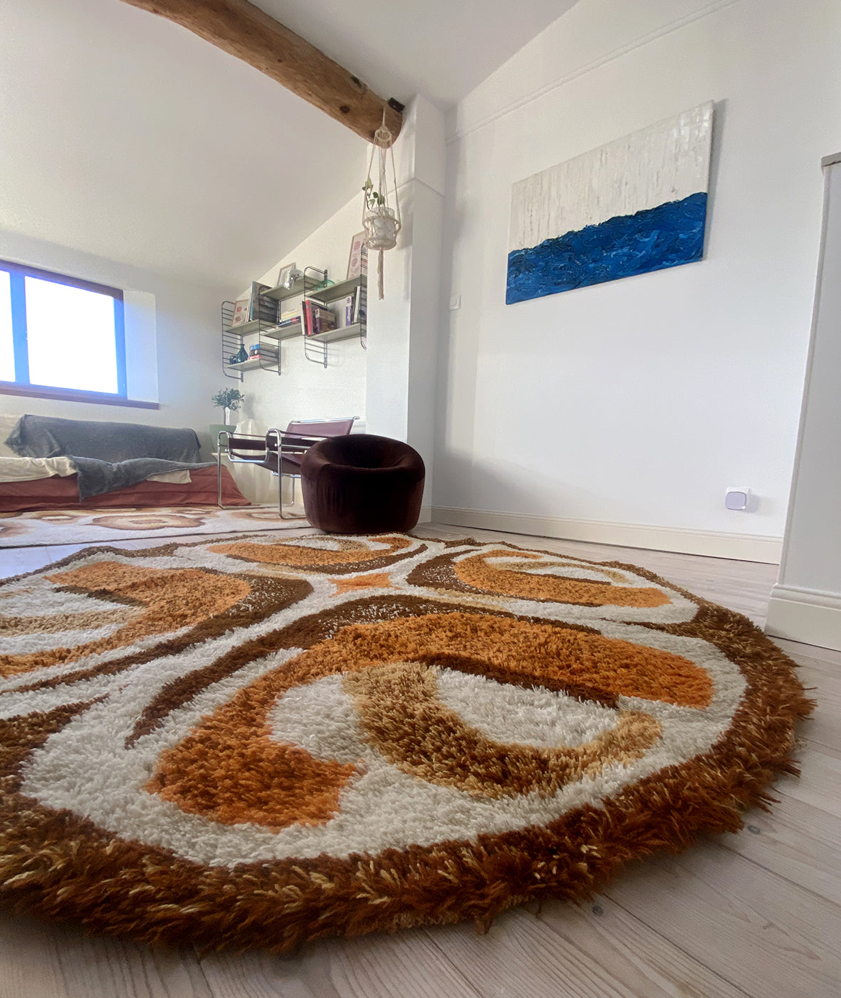 Tapis rond vintage des années 70 mêlants motifs brutalistes et primitifs. Tapis "rya" fait de mèches de laine vierge nouées sur une trame ce qui donne au tapis une texture épaisse et riche en nuances de couleurs. Tapis très décoratif qui magnifie tout intérieur. A noter, la trame du verso présente des défauts qui restent très peu visibles une fois le tapis en place (voir photos).