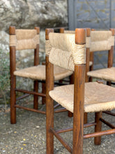 Very nice set of four dining room chairs, model Dordogne, edited by Sentou around 1950. The chairs are made of pine wood, the seats and backs are handmade in straw. With their raw materials, these chairs are perfect for a natural and authentic decoration.