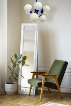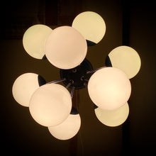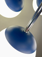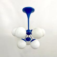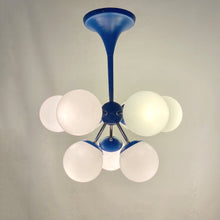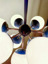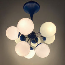 Lustre sputnik ou spoutnik Space-Age des années 60 composé de 9 feux. La structure est en métal de couleur bleue (proche d'un bleu "Klein") et est surmontée de globes de verre en opaline blanche. Superbe présence dans une pièce. Lustre en parfait état et qui fonctionne parfaitement. Electricité d'origine. Ampoules e14 non-incluses.