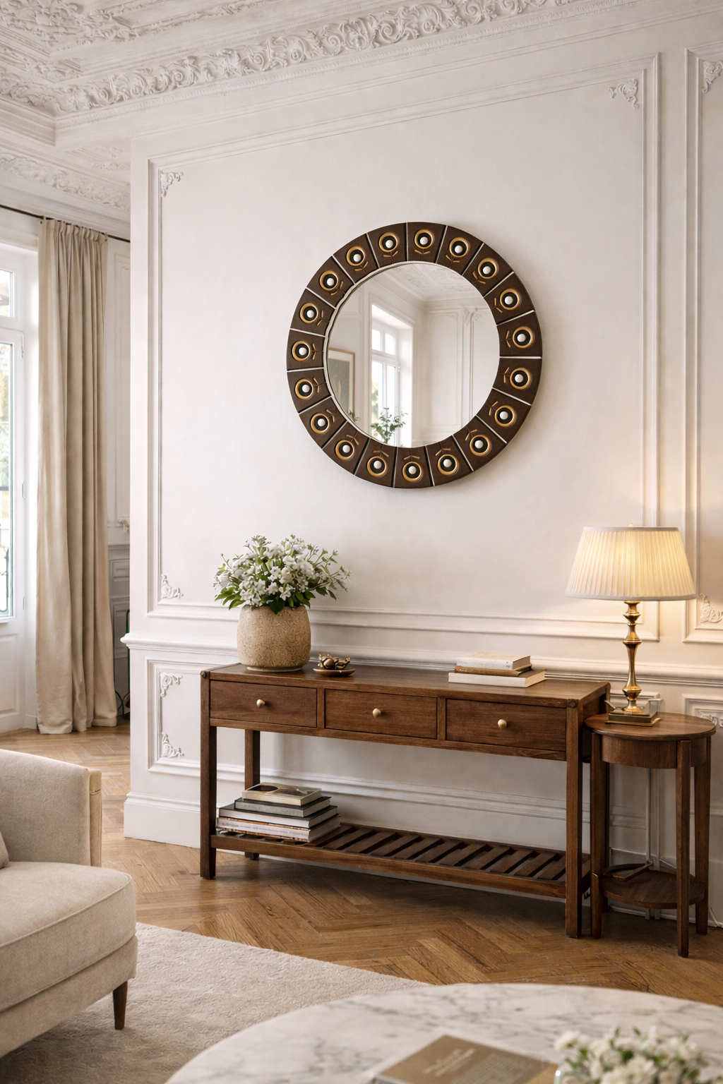 Gran espejo circular de los años 60/70, bordeado de azulejos esmaltados. Muy bonito trabajo de esmaltado que combina acabados mate y brillante con una hermosa paleta de colores acorde con su época. En cada azulejo se inscriben motivos florales estilizados. A destacar, un desconchón en un azulejo (ver fotos) que no afecta la estética general del espejo, que se mantiene en muy buen estado a pesar de las décadas transcurridas.